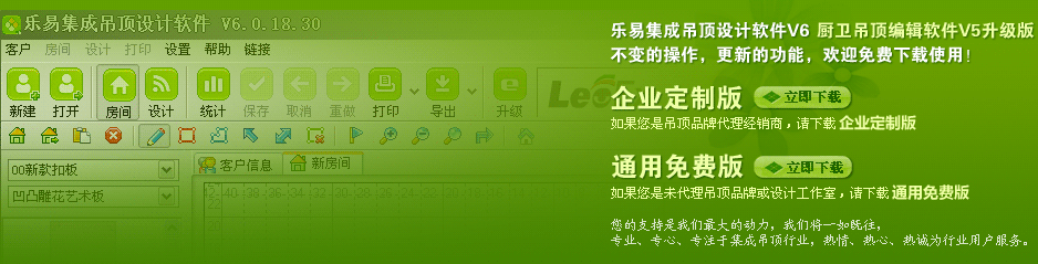 樂易集成吊頂設(shè)計(jì)軟件V6可以在本站上免費(fèi)下載安裝,我們非常希望您能把使用過程中的問題、意見、建議及時(shí)反饋給我們,以便我們不斷完善和升級(jí)軟件。