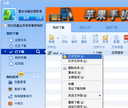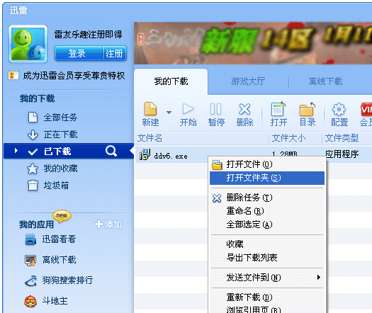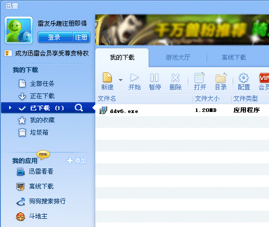 下載完成后我們可以打開迅雷軟件,在“已下載”項目里面找文件名稱為“ddv6.exe”的文件,雙擊即可安裝。如圖: